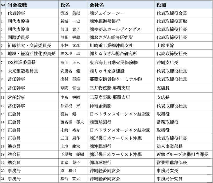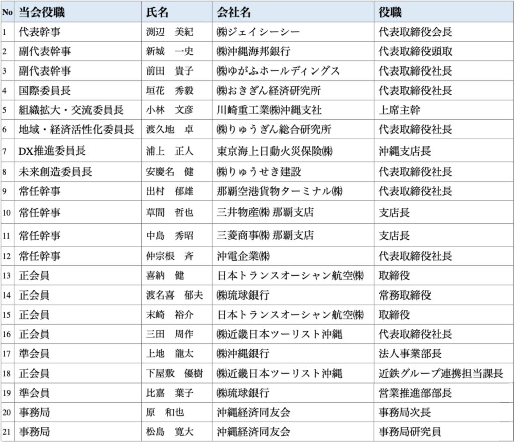 渕辺代表幹事、新城副代表幹事、前田副代表幹事、垣花委員長、小林委員長、渡久地委員長、浦上委員長、安慶名委員長、会員11 名、事務局 3 名 総勢 22 名